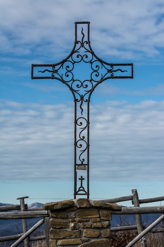 Tag: croce, cielo, nuvole, ferro, staccionata, pietre, muretto, steccato.