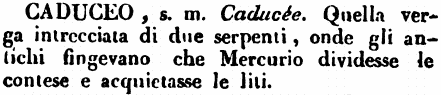Caduceo - s. m. Caducée. Quella verga intrecciata di due serpenti, onde gli antichi fingevano che Mercurio dividesse le contese e acquietasse le liti. [immagine]