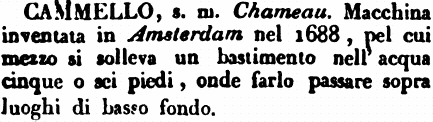 | Cammello - s. m. Chameau. Macchina inventata in Amsterdam nel 1688, pel cui mezzo si solleva un bastimento nell'acqua cinque o sei piedi, onde farlo passare sopra luoghi di basso fondo. [immagine] |