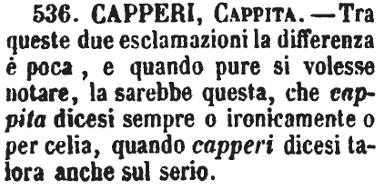 Capperi, Cappita - Tra queste due esclamazioni la differenza è poca, e quando pure si volesse notare, la sarebbe questa, che cappita dicesi sempre o ironicamente o per celia, quando capperi dicesi talora anche sul serio. [immagine]