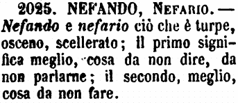 Nefando, Nefario - Nefando e nefario ciò che è turpe, osceno, scellerato; il primo significa meglio, cosa da non dire, da non parlarne; il secondo, meglio, cosa da non fare. [immagine]