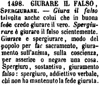 Giurare il falso, Spergiurare - Giura il falso talvolta anche colui che in buona fede crede giurare il vero. Spergiurare è giurare il falso scientemente. Giurare e spergiurare, modo del popolo per far sacramento, giuramento sull'anima, sulla coscienza, per asserire o negare una cosa. Spergiuro, sostantivo, giuramento falso: spergiuro, addiettivo verbale, chi non ha mantenuto la fede giurata. [immagine]